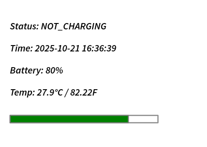2025-10-21 10:22:16 | NOT_CHARGING | 80 | 3.888 | -0.0025 | -0.00972 | 7.82266 | -804h -47m |